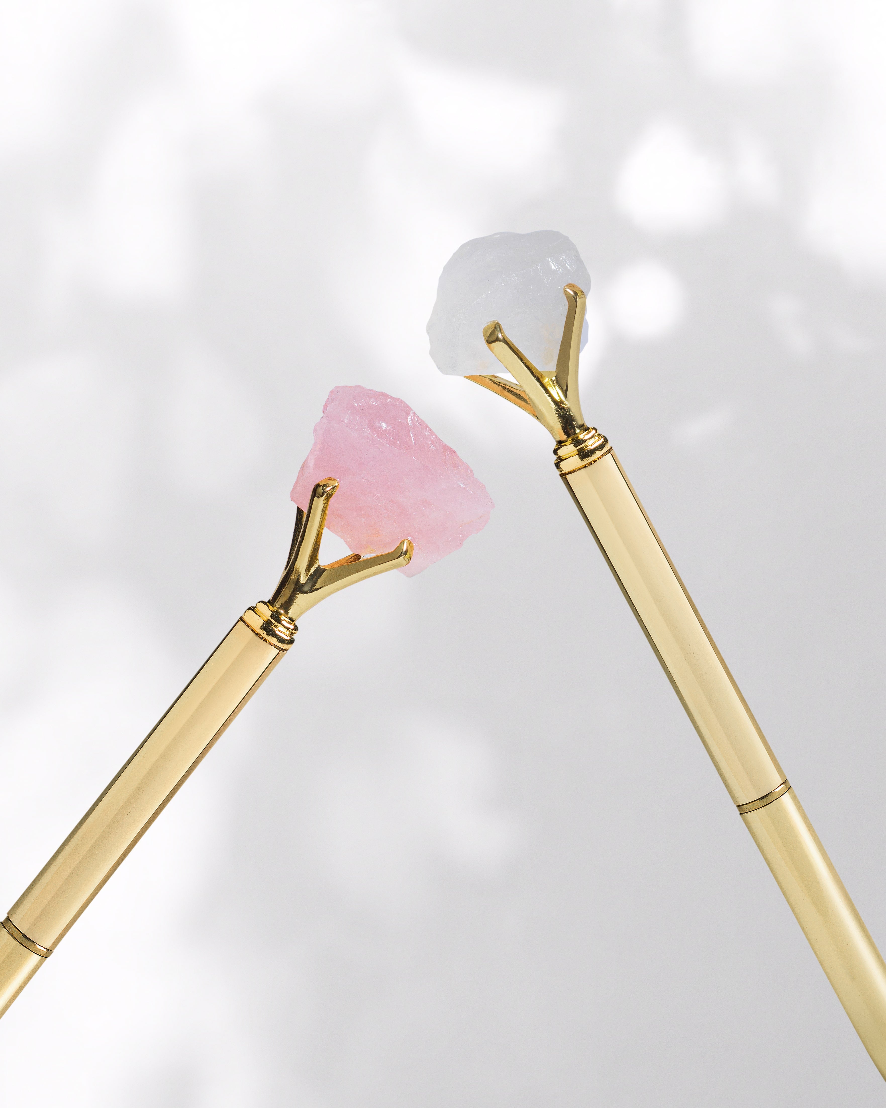 Der Rosenquarz-Kristallstift besteht aus hochwertigem, goldfarbenem Aluminium und enthält eine echte, naturbelassene Kristallspitze. Jeder Stift der Kollektion – Rosenquarz, Fluorit, Klarquarz oder Schwarzer Obsidian – trägt seine ganz eigene energetische Wirkung für mehr Fokus, Energie oder emotionale Balance.